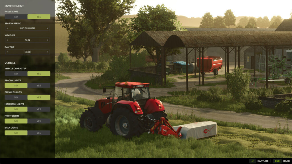 You can freely move and rotate the camera, change the field of view (FOV), choose a season, set the weather (rain, hail, cloudy, or sunny), choose the time of day, pause or unpause the game, adjust vehicle lights and character visibility, and play multiplayer!
